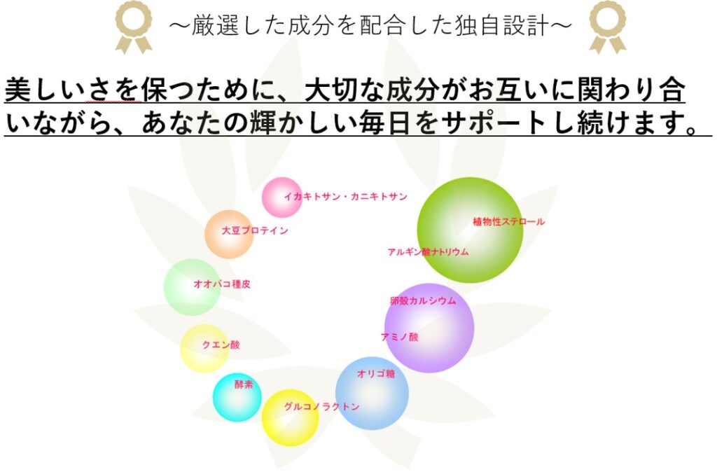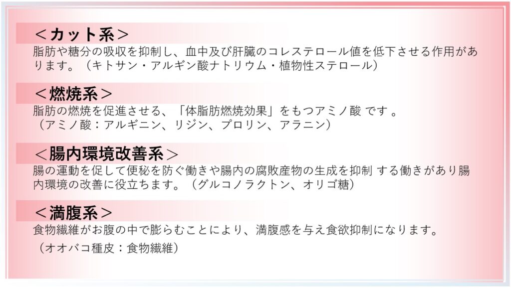 | 原材料名 | 難消化性デキストリン、ぶどう糖、 ピーチ果汁末(デキスト リン、ピーチ果汁)、 大豆たんぱく、フラクトオリゴ糖、植物発酵エキス 末(オレンジ・カシューナッツ・キウイフルーツ・ごま・バナナ・りんご を含む)/グルコノラクトン、キトサン(かに・いか由来)、クエン酸、安定剤 (アルギン酸ナトリウム、ポリアクリル酸ナトリウム)、サイリウムシード ガム、香料、クエン酸三ナトリウム、卵殻未焼成カルシウム、甘味料 (アスパルテーム・L-フェニルアラニン化合物、 ソーマチン)、 植物性 ステロール、L-リジン塩酸塩、 L-アラニン、L-アルギニン、L-プロリン |